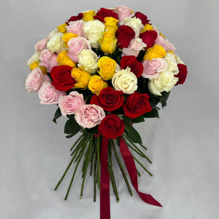77 de trandafiri proaspeti in combinatia de rosu, alb