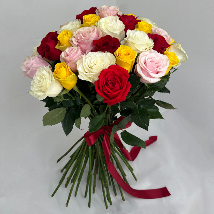 51 de trandafiri proaspeti in nuante de rosu, alb si roz.