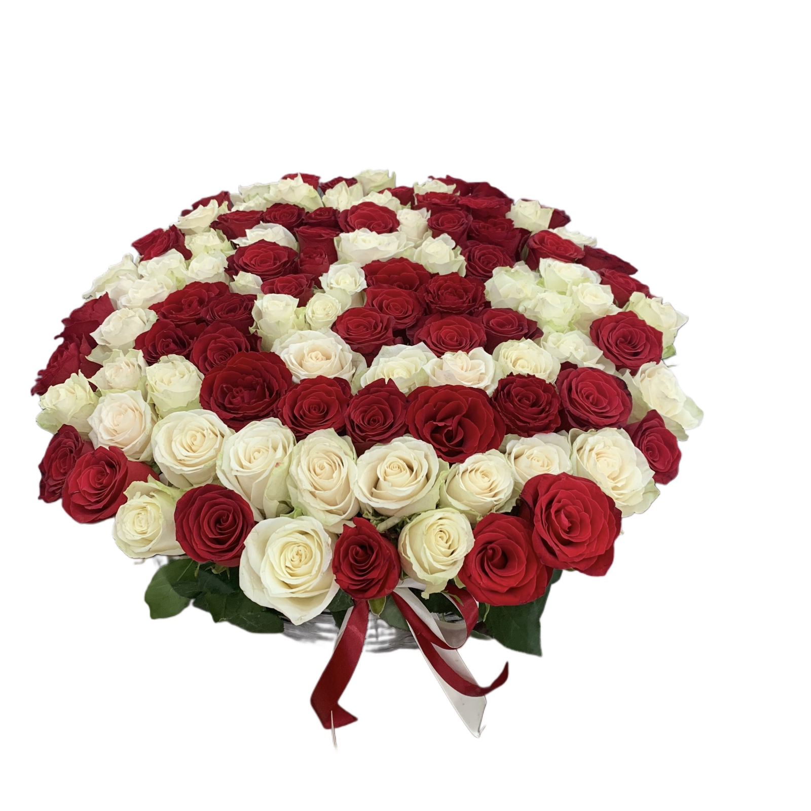 Cosul cu 101 Trandafiri Roșii și Albi cu inaltimea de 40-50 cm este o alegere sofisticată și elegantă, ideală pentru ocazii speciale, simbolizând dragoste, puritate și pasiune. Trandafirii roșii, cunoscuți pentru a reprezenta iubirea profundă, sunt combinati armonios cu trandafiri albi, care exprimă puritate, respect și sinceritate. Această combinație creează un contrast vizual spectaculos și atrăgător.